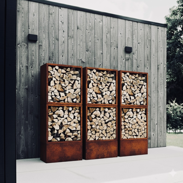 Den större volymen gör modellen idealisk vid grillzoner, eldstäder eller som bas i en större vedvägg. Tack vare BLOCK-systemets harmoni i mått kan modulen kombineras fritt med bord, baslådor, avskärmningar och planteringsmoduler för att skapa strukturerade och stilrena helhetsmiljöer.
